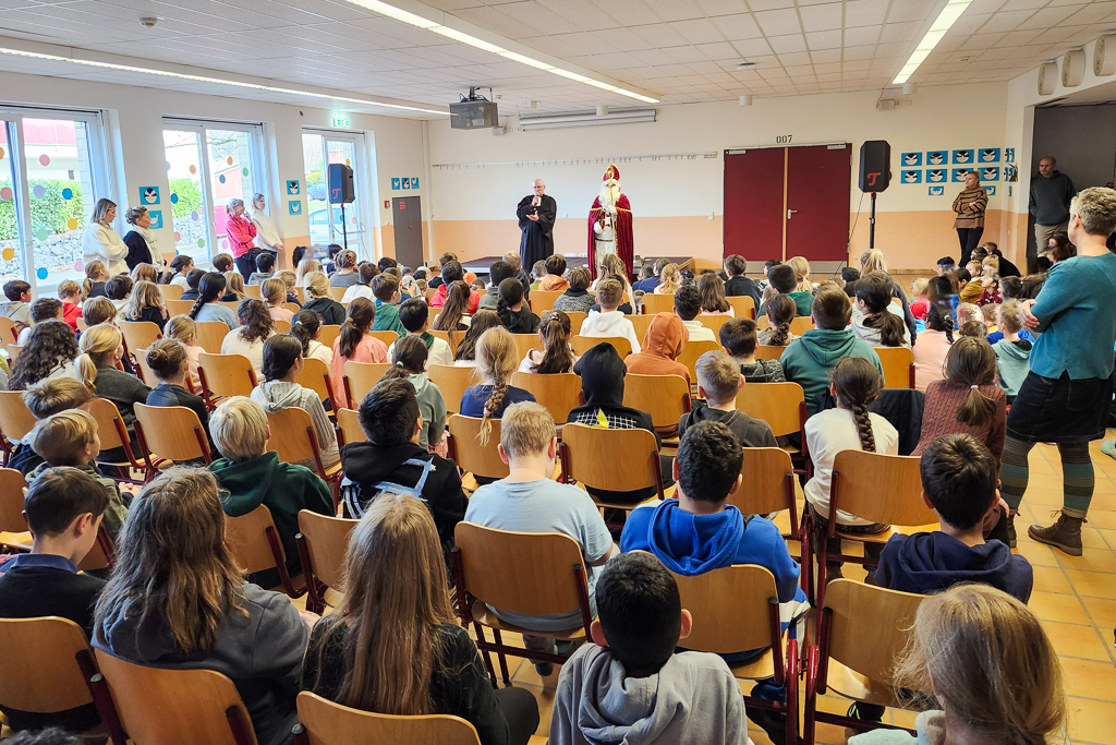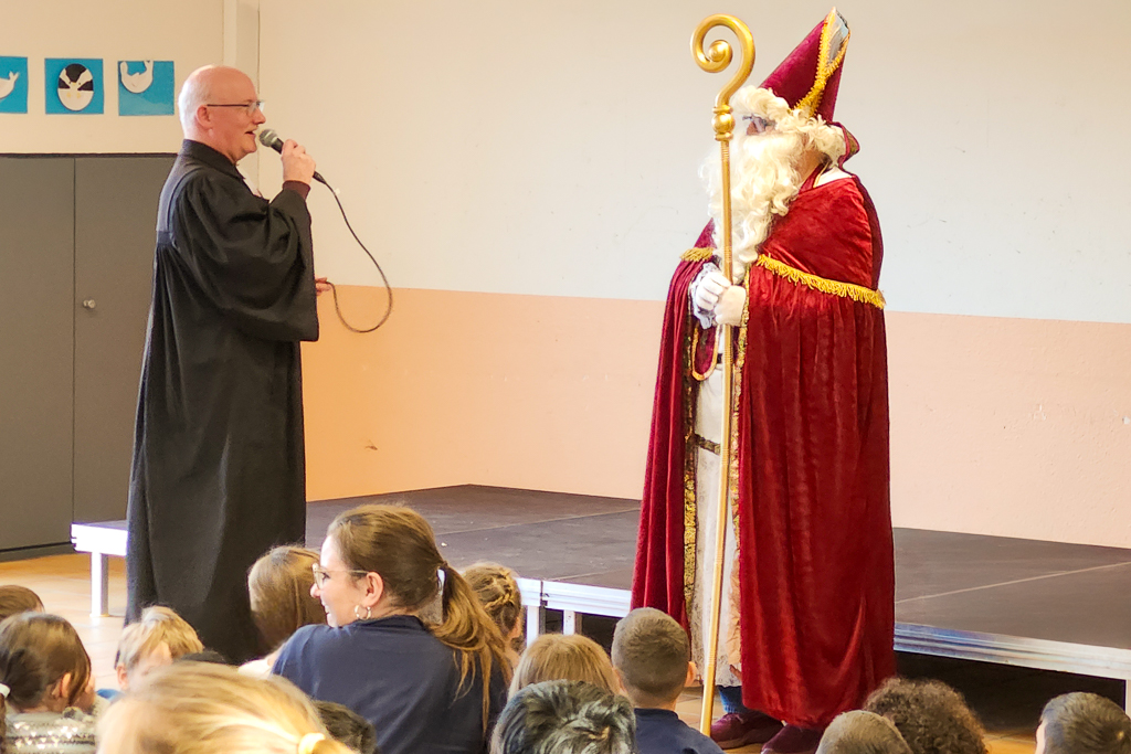 Einen Tag vor dem eigentlichen Nikolaustag versammelte sich die ganze Schulgemeinschaft im Forum, um gemeinsam Weihnachtslieder zu singen. Angelockt von unserem Gesang klopfte es plötzlich an der Tür und der Nikolaus trat ein.