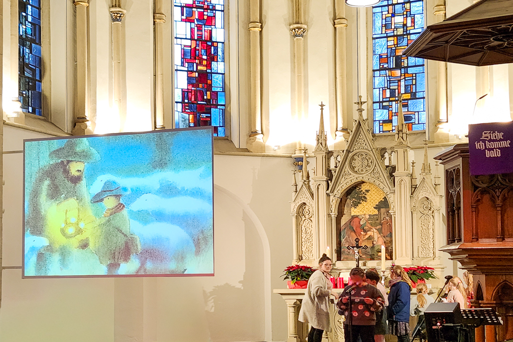 Zu den Bildern des Buches „Die vier Lichter des Hirten Simon“ lasen die Kinder die Texte vor. Alle Gottesdienstbesucher hörten aufmerksam zu. Der kleine Hirte Simon verschenkt alle seine Lichter und hat damit das Leben anderer Menschen etwas heller und schöner gemacht. An Weihnachten feiern wir, dass Jesus für uns Menschen Licht sein will und unser Leben heller und schöner machen möchte. Auch wir können Licht verschenken und andere froh machen. Das wurde in den Fürbitten deutlich.